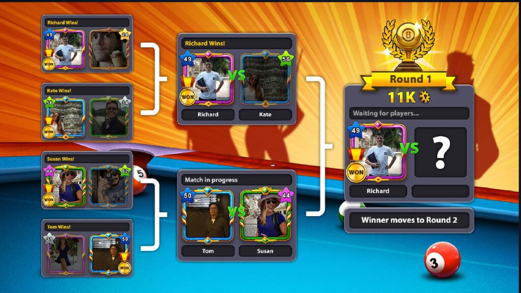 8 Ball Pool features a robust progression system. Players earn experience points and coins by participating in matches and tournaments. These resources can be used to unlock new cues, purchase customizations, and access higher-stake games.